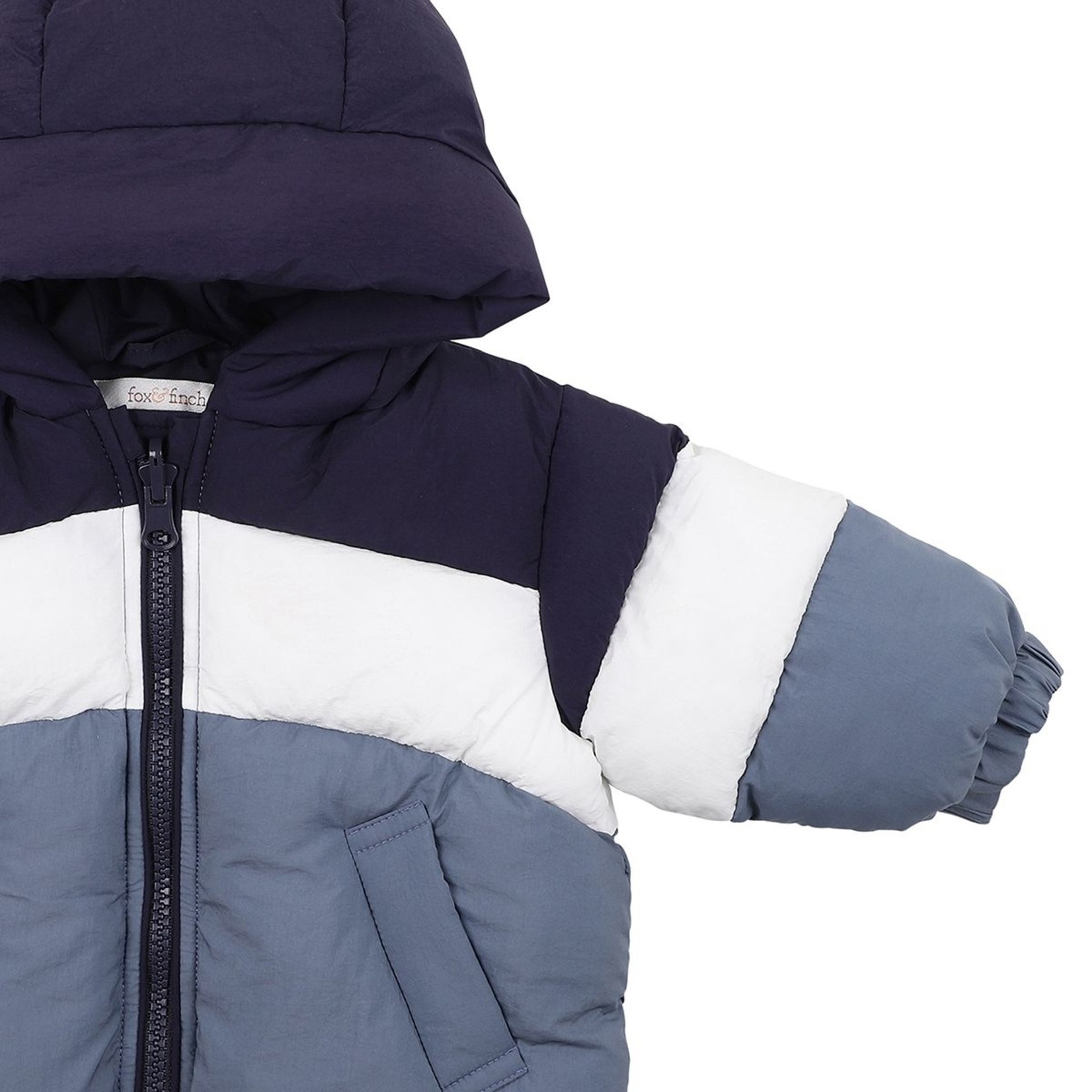 This stylish spliced hooded puffa jacket is soft, warm, and comfy. Featuring a front zip opening, front welt pockets and elasticated cuffs, making it a winter staple for your little one's wardrobe.